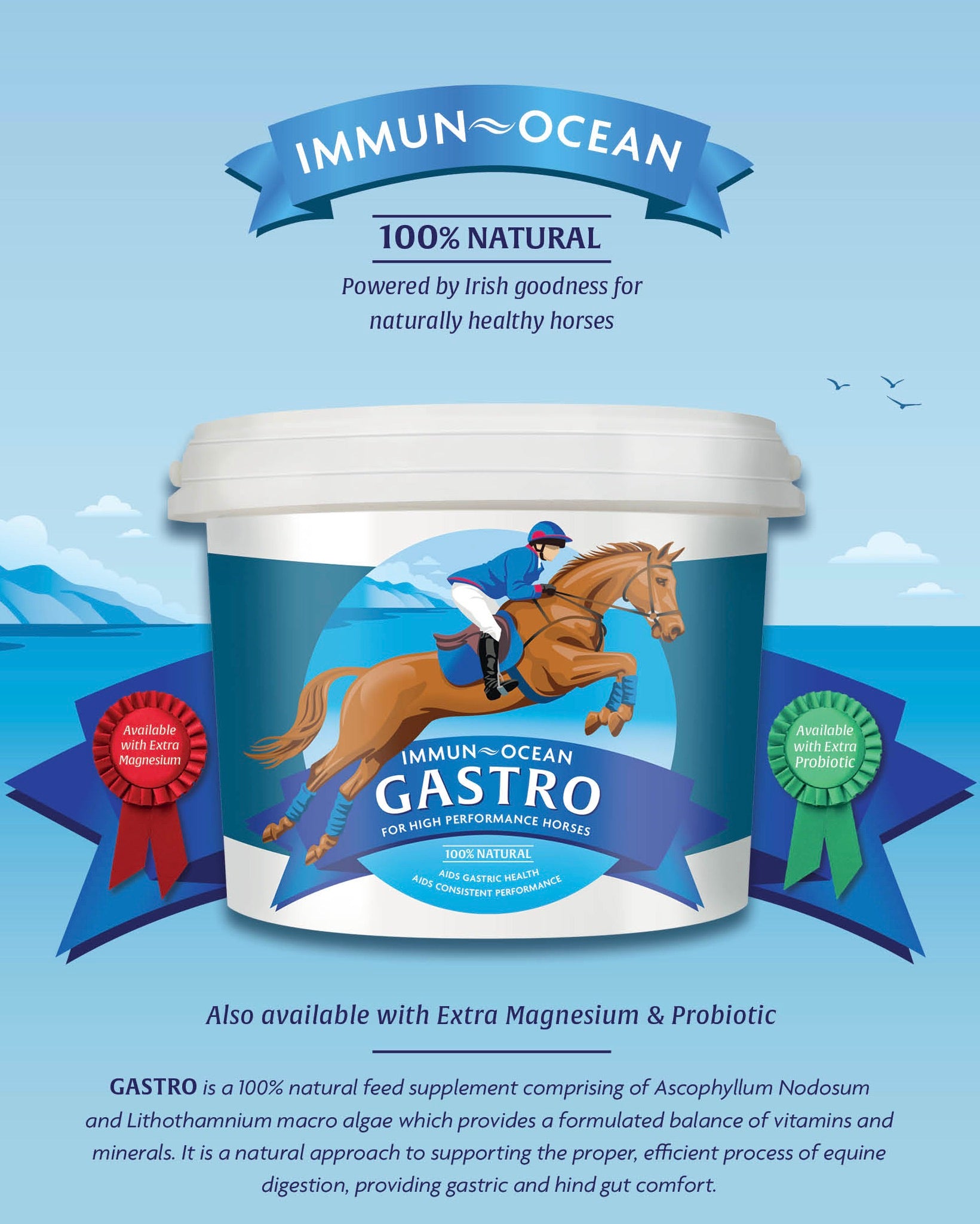 Immun-Ocean GASTRO EXTRA PROBIOTIC is a daily multifactorial, all natural performance supplement expertly formulated to support the digestive health of high performance horses and breeding stock with on going gastric issues. Made from Ascophyllum Nodosum and Lithothamnium, it delivers a perfectly balanced combination of essential vitamins and minerals.  This natural blend promotes efficient digestion, ensuring both gastric and hind gut comfort.